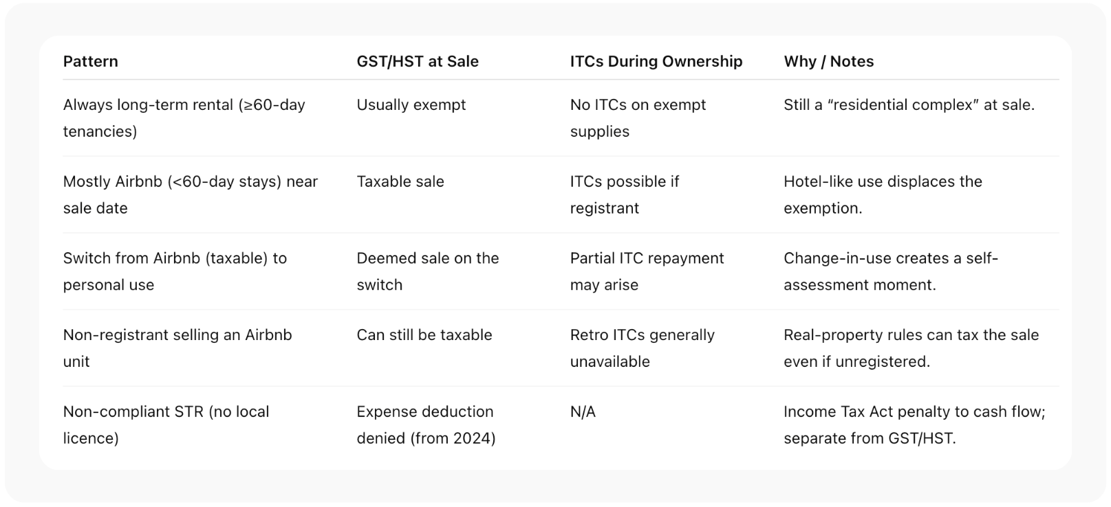 Courts have emphasized the use at the time of sale. Where the unit is offered and used for <60-day stays near closing, it’s not a “residential complex,” and the sale is taxable under HST/GST. A last-minute attempt to “flip” to personal use can itself trigger a change-in-use deemed sale before closing—two tax touchpoints instead of one.
