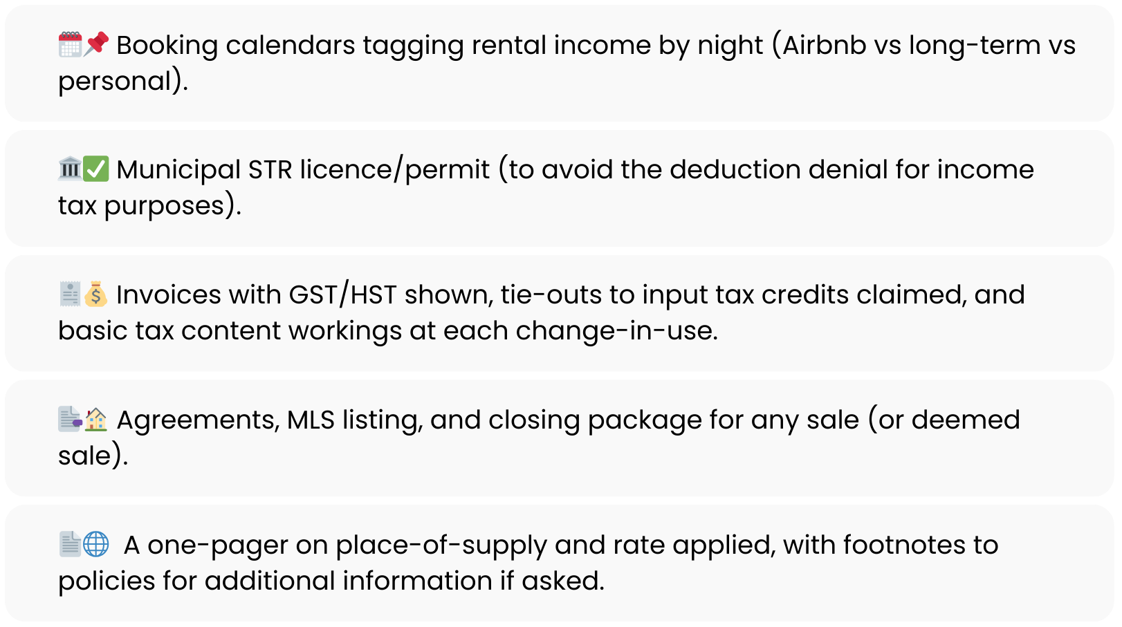 Expect a CRA audit to test use patterns, registration, and ITC math. Build a file that can be handed to an auditor without explanation: