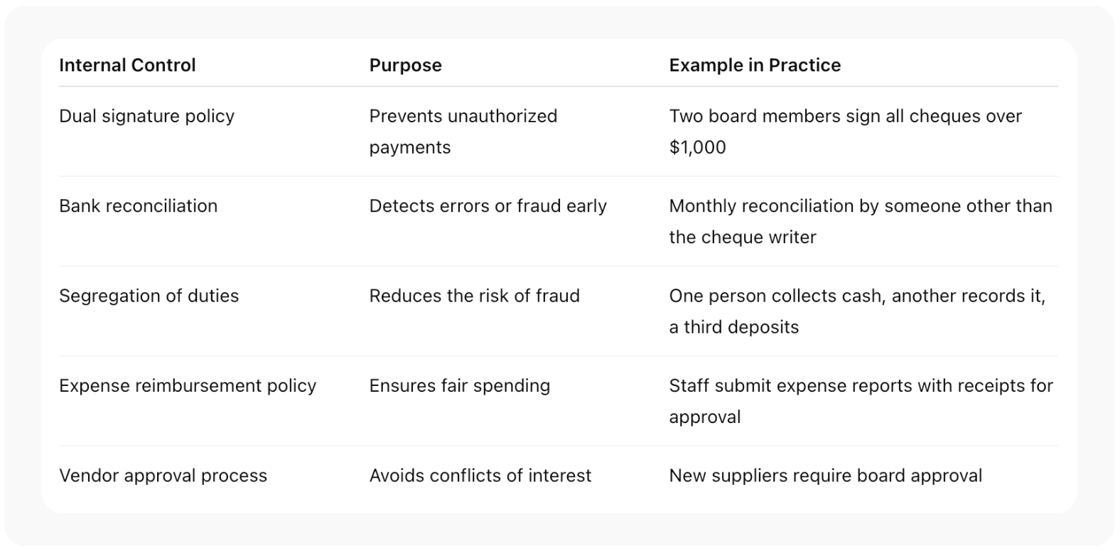 Canadian nonprofits can adopt many practical measures. Here are some common internal controls examples: