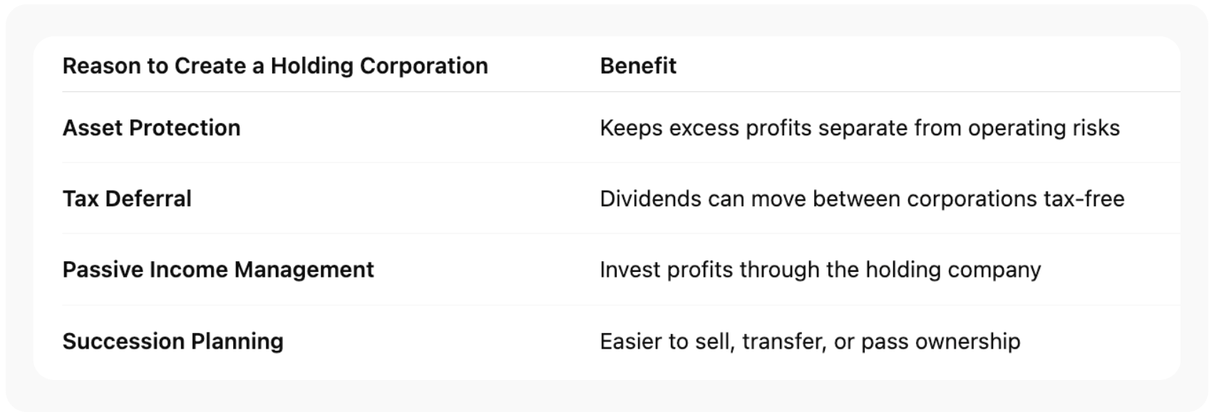 A holding corporation doesn’t operate a business directly—it owns one or more operating corporations. This setup offers protection, flexibility, and better control of income earned.