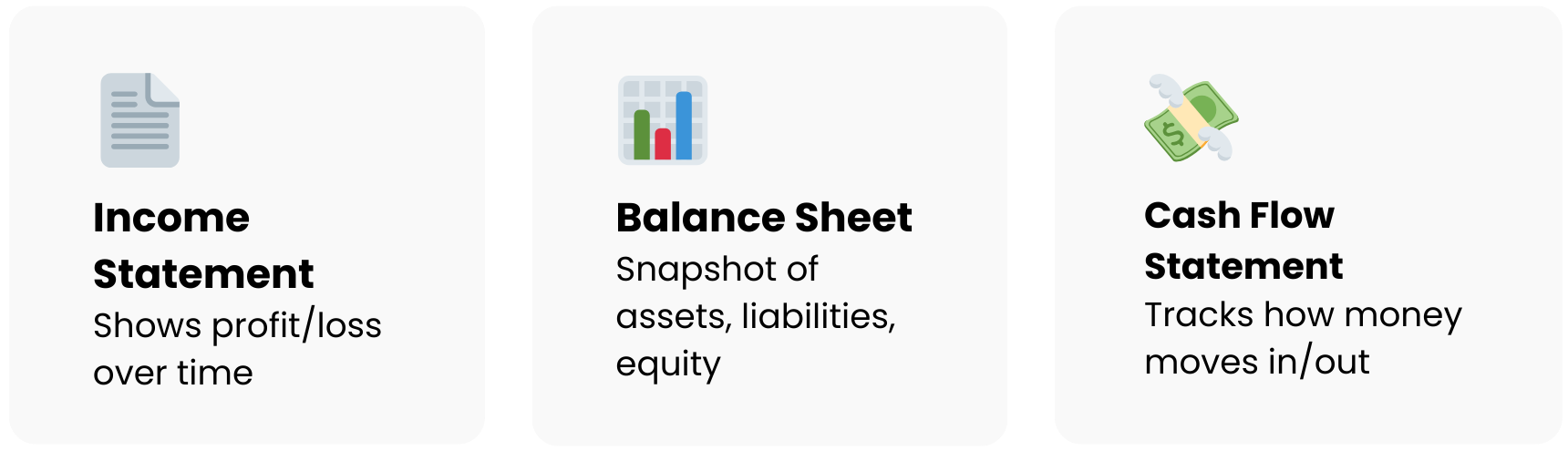 | Income Statement | Income, expenses, and profit/loss | Tells if your business is profitable |