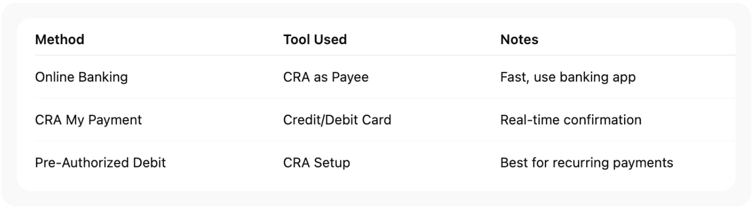 Use CRA My Payment, online banking, or set up pre-authorized debit.