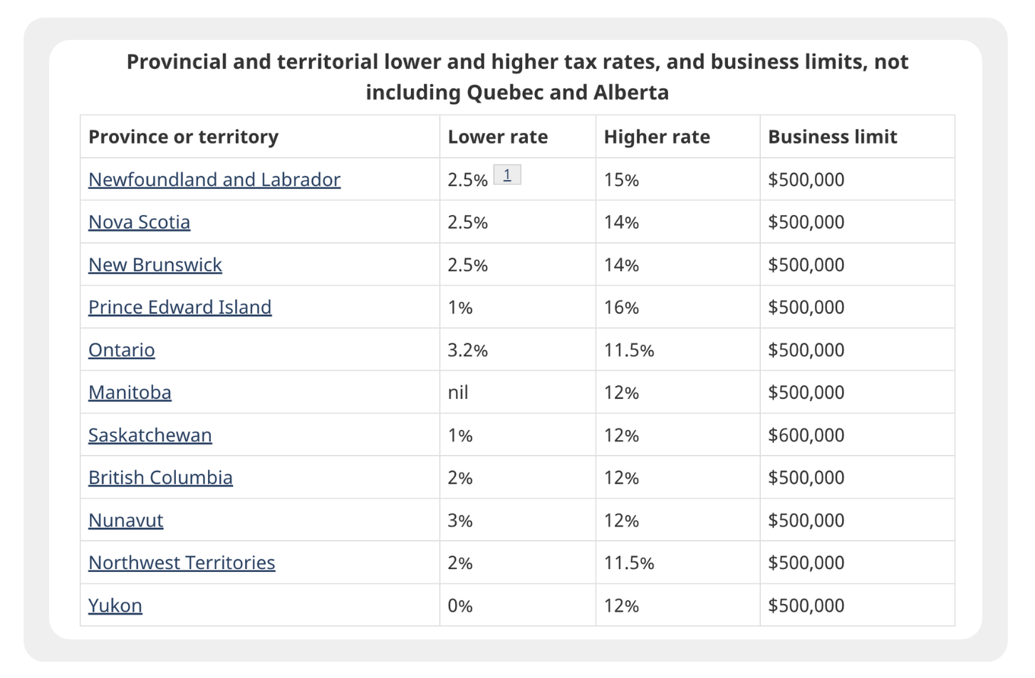 This table is for illustration only. Always confirm the latest figures via your province’s government websites or with a qualified accountant. If you run a company tax Canada search for updated numbers, ensure you include “2025” in your query.