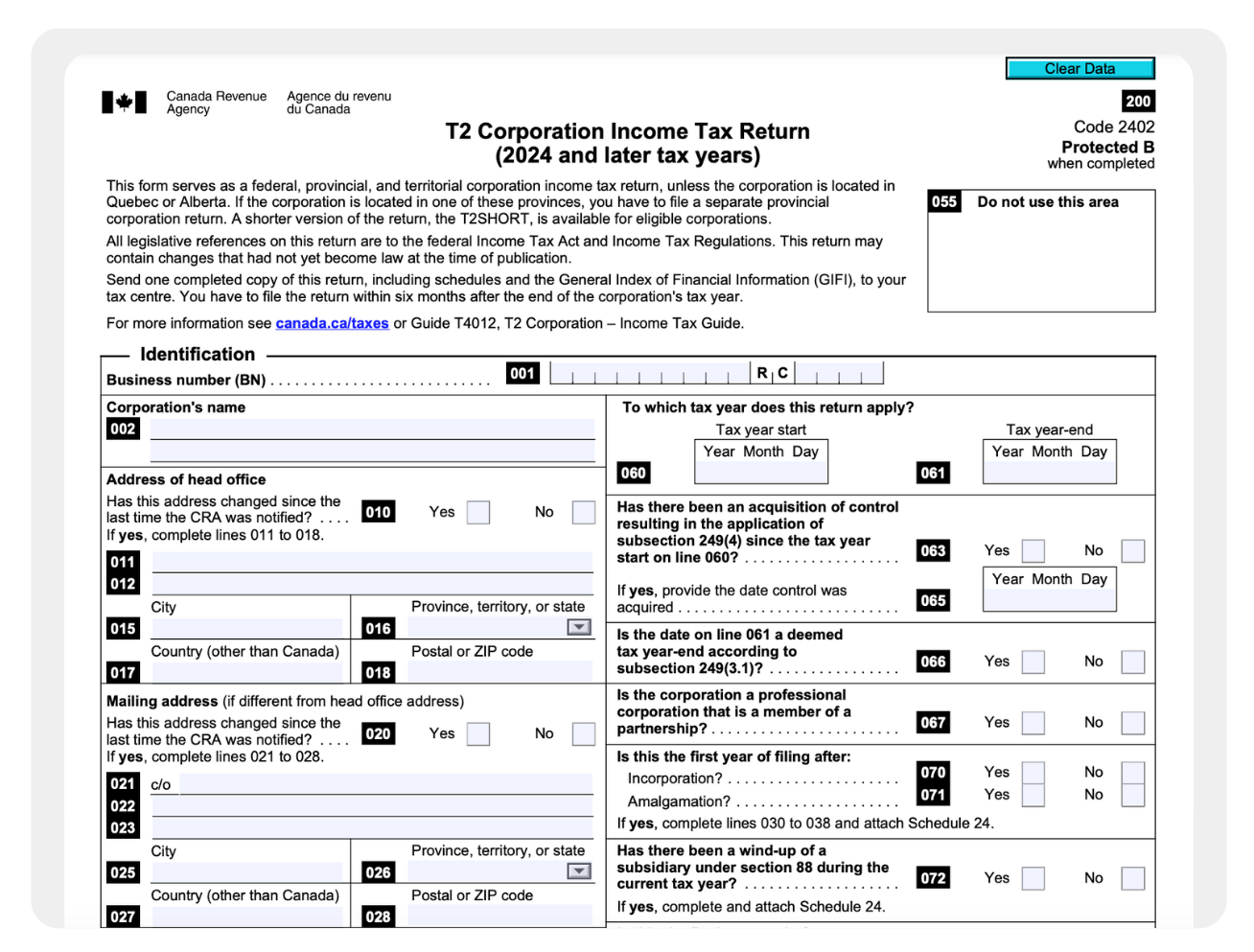 Every Canadian corporation must submit a T2 Corporate Income Tax Return yearly—even if inactive. The T2 includes details on your canada business income tax, expenses, and deductions.