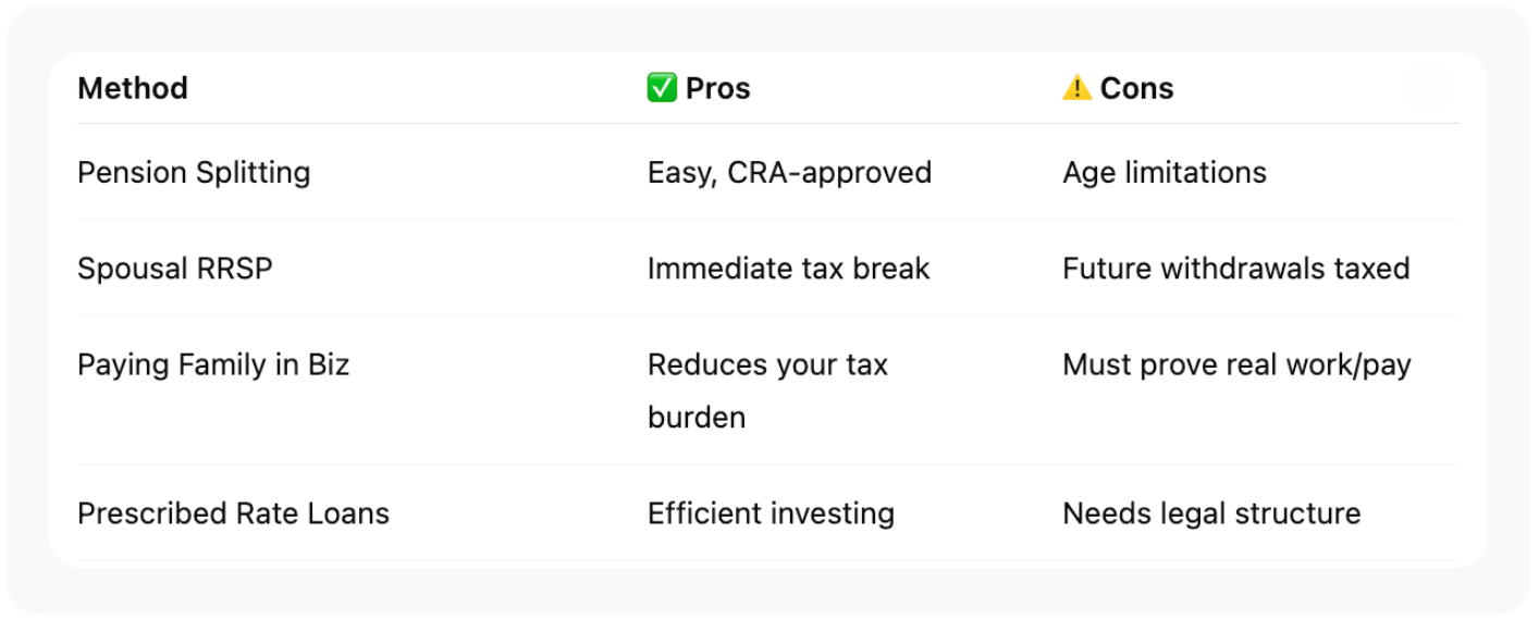 You can simply start by documenting all transactions, including income transfers, compensation for work done, and investments. This ensures transparency and compliance at all times. Use only Canada Revenue Agency (CRA)-approved tools like pension income splitting, spousal RRSPs, or prescribed rate loans. These methods are clearly defined and accepted under the tax laws.