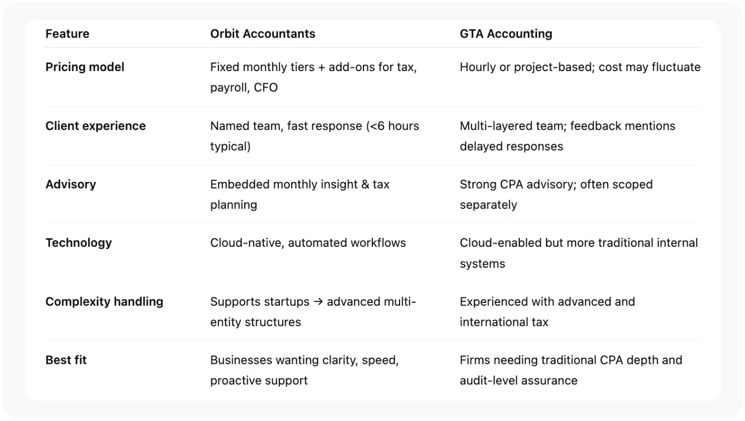References to GTA Accounting or any other firms are for comparative context only. Orbit Accountants is not affiliated with these organizations, and all trademarks, logos, or brand names remain the property of their respective owners. Readers should independently verify pricing, scope, and service details before making any business decisions.