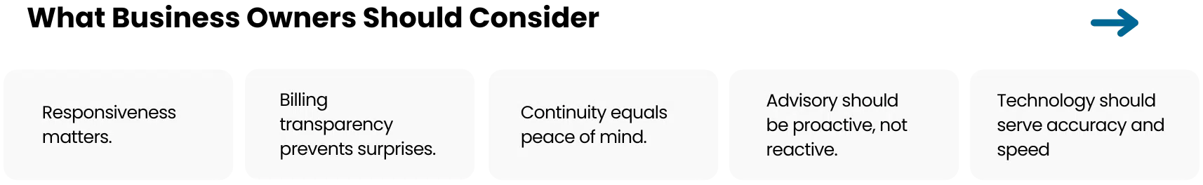 When choosing an accounting partner, it’s not just about who files your taxes — it’s about how the firm communicates, follows through, and supports your growth.