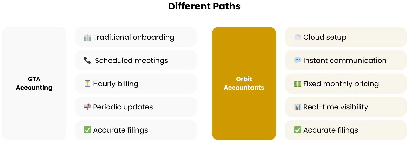 Both Orbit and GTA Accounting can manage your books and filings — but how they manage your experience is where the difference lies.