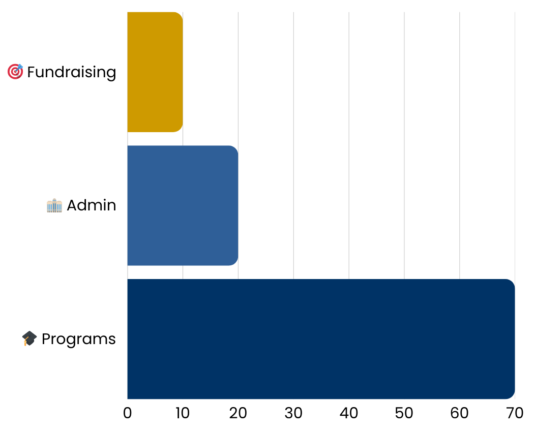 Program expenses support direct mission delivery. Fundraising covers donor outreach, campaigns, and events.