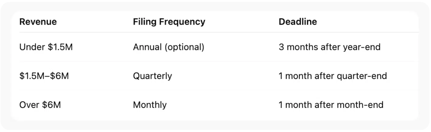 Your filing frequency depends on your annual revenue: