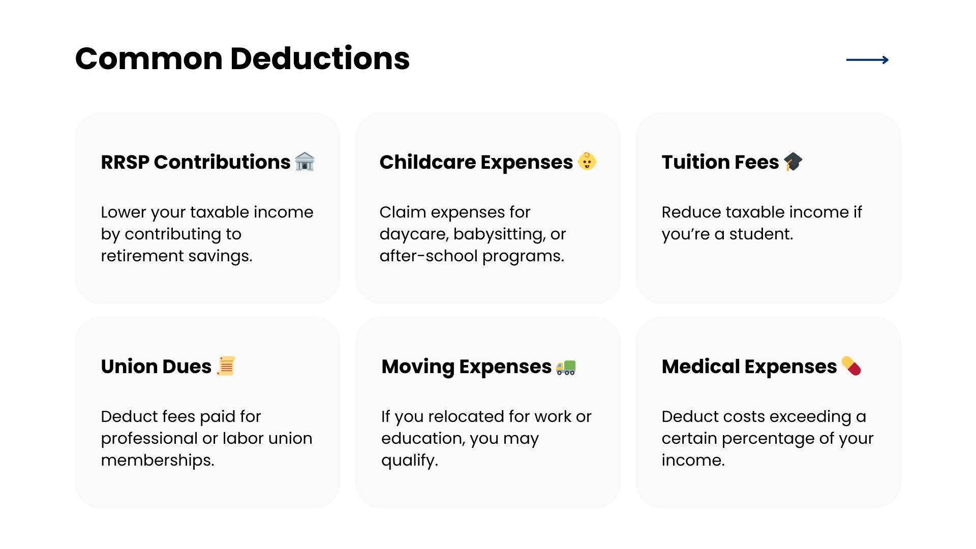 Deductions like RRSP contributions, child care expenses, and student loan interest can lower your taxable income, reducing the amount of tax you owe.