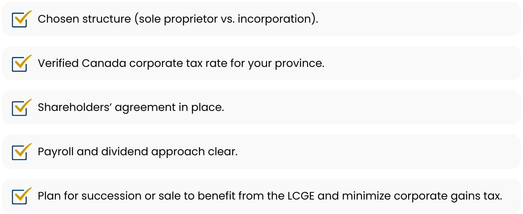 - Decide between federal incorporation or provincial (e.g., BC for a sole proprietorship upgrade).